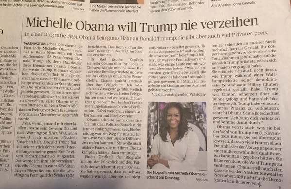 „Michelle Obama will Trump nie verzeihen“ – das wusste heute schon die Rheinische Post in Düsseldorf (s. Abb.) und das war sinngemäß auch gestern schon in der WELT AM SONNTAG vorab zu lesen. Nichts davon aber darf sichtlich bislang aus der deutschen Ausgabe ihrer Memoiren durchsickern, die morgen auch hierzulande erscheinen werden. Das hatte sich Random House von allen Buchhandlungen mit einer ausgefeilten Vereinbarung unterschreiben lassen.