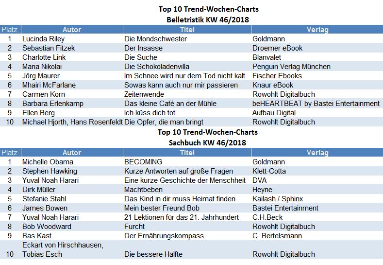 Die Top 10 ebook Trend Charts in Belletristik und Sachbuch werden wöchentlich durch media control GmbH ermittelt und in den eBook-Shops zur Verfügung gestellt: