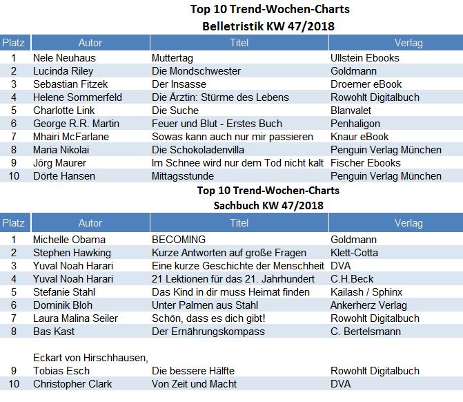 Die Top 10 ebook Trend Charts in Belletristik und Sachbuch werden wöchentlich durch media control GmbH ermittelt und in den eBook-Shops zur Verfügung gestellt: