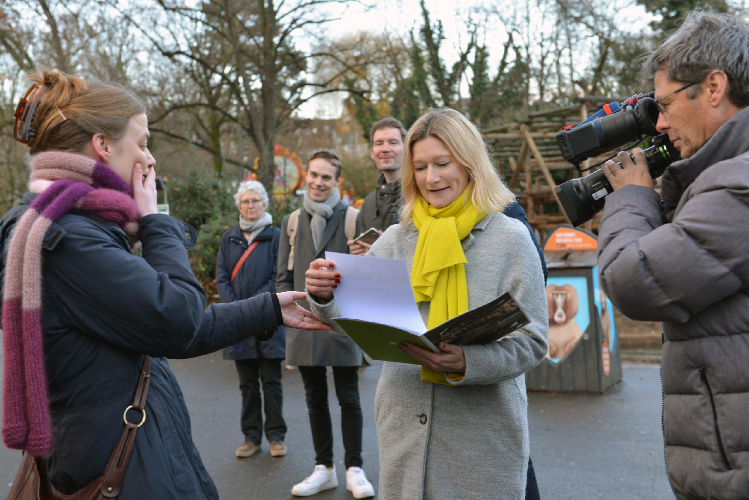 Überraschung für Bestseller-Autorin Mariana Leky heute Nachmittag im Kölner Zoo: Eigentlich war sie dort, weil ein Team des WDR einen Beitrag über sie drehen wollte. Das geschah auch – doch obendrein hatte der DuMont Verlag ein großes Dankeschön für sie vorbereitet: Verlegerin Sabine Cramer übergab Mariana Leky die Urkunde über eine Patenschaft für den Okapi-Bullen Dayo. Denn das Okapi spielt eine besondere Rolle in ihrem Roman Was man von hier aus sehen kann, der im Sommer 2017 erschien und sich zu einem furiosen Erfolg entwickelte. Der Roman wurde als Lieblingsbuch der Unabhängigen 2017 gewählt, er wurde von BuchMarkt-Leserinnen und -Lesern zum Buch des Jahres gekürt – und Mariana Leky zur Autorin des Jahres.