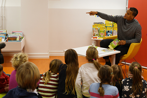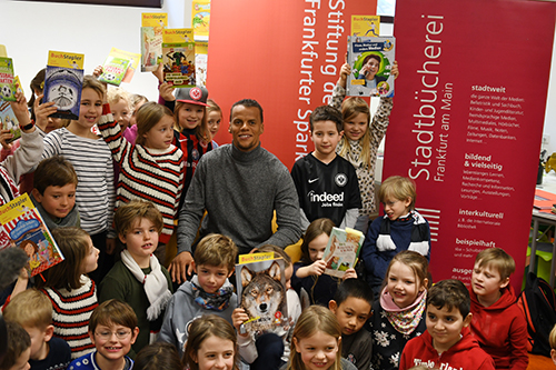 Ottilie Wenzler, Geschäftsführerin der 1997 gegründeten Stiftung der Frankfurter Sparkasse, unterstützt die Leseförderaktion gerne. Da die Stiftung auch Premium-Partner von Eintracht Frankfurt ist, lag es auf der Hand, den Eintracht-Profi Timothy Chandler zu fragen, ob er zum Auftakt dabei sein könne. Der sagte schnell zu: „Es geht um Kinder, da helfe ich gerne.“ Er selbst hätte sich gefreut, wenn es während seiner Grundschulzeit die Möglichkeit gegeben hätte, eine Bibliothek gemeinsam mit der Klasse zu besuchen. Doch davon wusste er nichts und ging so lieber auf die Straße, um Fußball zu spielen. „Heute muss einer, der Fußball-Profi werden will, gute Leistungen in der Schule haben, sonst wird nichts daraus“, sagte er den rund 50 Zweitklässlern später.