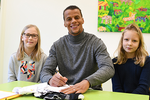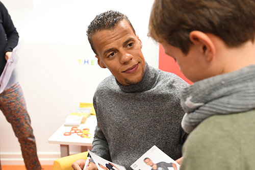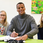 Zunächst las er aus dem Buch Das Ravioli-Chaos von Katja Reider, Rowohlt Taschenbuch, und aus Mega verrückte Fußballfakten von Christiana Braun, Fischer Meyers Kinderbuch, vor. Anschließend durften die Mädchen und Jungen Fragen stellen – sie trauten sich und wollten wissen, wie alt der Profi ist, ob er gerne liest, wie viele Rote Karten er bekam, wie viele Tore er schoss. Anschließend schrieb Chandler geduldig Autogramme und beantwortete zudem die Fragen von zwei Reporterinnen der Schülerzeitung.