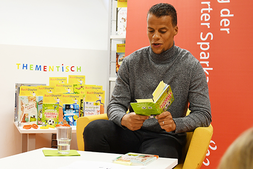 In der Frankfurter Textorschule herrschte schon seit Tagen helle Aufregung: Zum Start der Leseförder-Aktion BuchStapler war Eintracht Frankfurt-Spieler Timothy Chandler angekündigt. Der stand dann tatsächlich am gestrigen Montagmorgen in der kleinen Schulbibliothek. Roswitha Kopp von der Stadtbücherei Frankfurt erläuterte die Aktion, die mittlerweile im 24. Jahr stattfindet. Rund 3000 Kinder jährlich beteiligen sich. Vor drei Jahren wurde aus dem ursprünglichen Buch auf – Meinung ab! der Titel BuchStapler. Damit sollen Kinder im Alter zwischen acht und zwölf Jahren angesprochen werden. Das Ziel ist gleich geblieben; es geht nicht nur darum, mindestens einen der 30 von Kinderbuchexperten der Stadtbücherei ausgesuchten 2018 erschienen Titel in den Gruppen Kinderbücher und Kindersachbücher zu lesen, sondern den Inhalt auch mit ein paar eigenen Worten einzuschätzen.