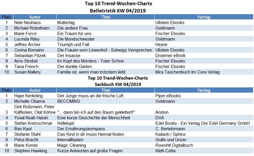 Die Top 10 ebook Trend Charts in Belletristik und Sachbuch werden wöchentlich durch media control GmbH ermittelt und in den eBook-Shops zur Verfügung gestellt: