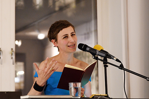 Ulrike Almut Sandig bedankte sich nach Übergabe der Urkunde zunächst bei den Menschen, die ihre Gedichte lesen und hören und trug anschließend einige Gedichte vor. Unterstützt wurde sie bei der Performance von Sebastian Reuter.