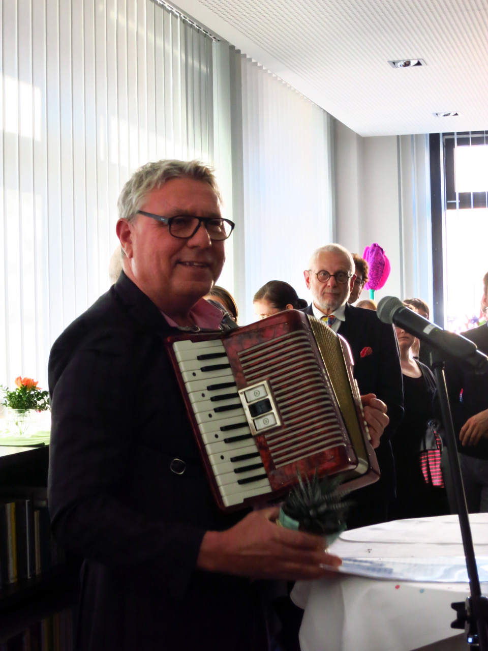 Wer jetzt denkt, es wurde langweilig, irrt sich gewaltig. Dietmar Holzapfel, der Wirt der Deutschen Eiche – ja richtig, das ist das ehemals öffentliche Wohnzimmer von Rainer Werner Fassbinder und anderen eigenwilligen Kulturgrößen der Stadt – hatte seine Quetschen (für die Nichtsüddeutschen: Harmonika) mitgebracht und sang für und mit Claudia Baumhöver sowie allen Gästen den Song „Mein kleiner Kaktus, dideldü dideldi didelda, ja.“