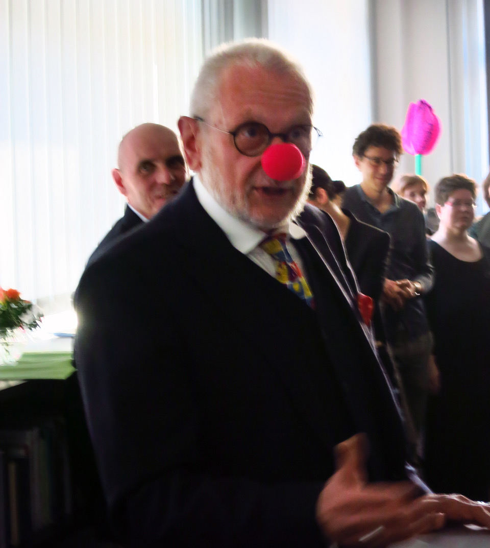 Stephan Joß, Geschäftsführer beim dtv-Gesellschafter Hanser brannte in seiner gereimten Rede ein wahres Feuerwerk ab. „Mit 20 war sie pädagogisch, heute fragt sich keiner mehr, war das logisch? Am Ende, ihr wisst es genau, landet man beim dtv!“ Er setzte sich eine rote Nase auf, animierte das Geburtstagskind zum Füßetrampeln und Hüpfen und dichtete ihr neue Bestseller an, die alle eine fiktive Claudia als Protagonistin im Mittelpunkt haben.