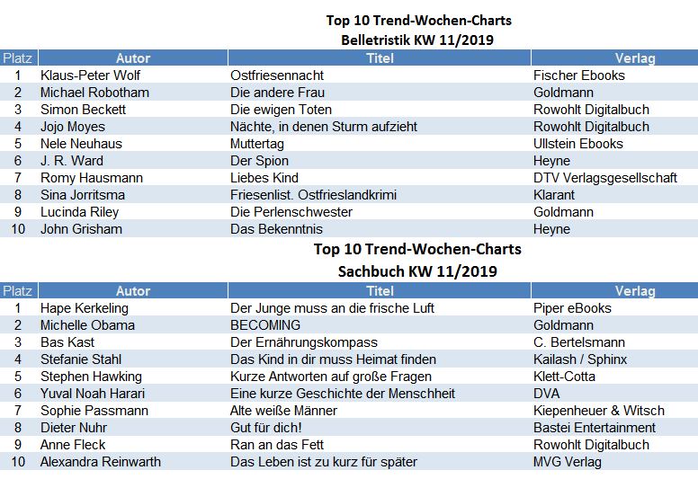 Die Top 10 ebook Trend Charts in Belletristik und Sachbuch werden wöchentlich durch media control GmbH ermittelt und in den eBook-Shops zur Verfügung gestellt: