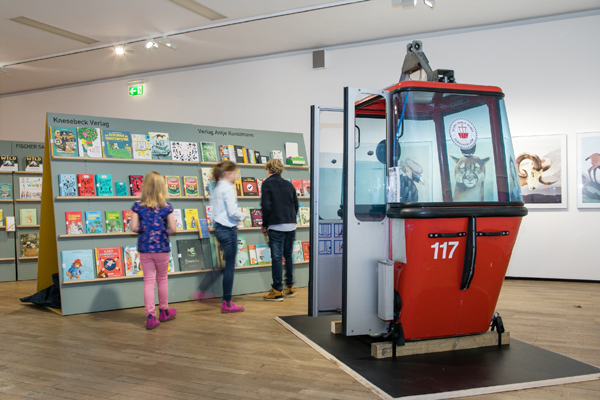 Die Originalillustrationen von Katharina Sieg aus „Das blaue Herz von Finn“ schmückten die Wände der Ausstellungsräume sowie Bilder aus Das magische Auge und die wunderbaren Illustrationen von Piotr Socha aus Bäume. Und Dieter Braun entführte mit seinen Bildern in „Die Welt der Berge“ – dazu als besondere Attraktion in der Ausstellung: eine echte Gondel, die als Lesekabine viele Fans fand. Ergänzend zu der großen Buchausstellung gab es wieder die Sonderausstellungen Schullektüren, Bücher für Erstleser, mehrsprachige Bücher sowie die Empfehlungen von BuchhändlerInnen und Leseclubs und die von den Expertinnen Christine Paxmann, Sylvia Mucke und Birgit Franz ausgesuchten Kinderbücher „Neu und Lesenswert“ (die Leselisten zu den Empfehlungen gibt es hier zum Download).