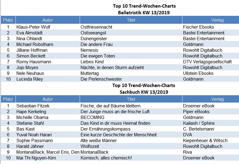 Die Top 10 ebook Trend Charts in Belletristik und Sachbuch werden wöchentlich durch media control GmbH ermittelt und in den eBook-Shops zur Verfügung gestellt: