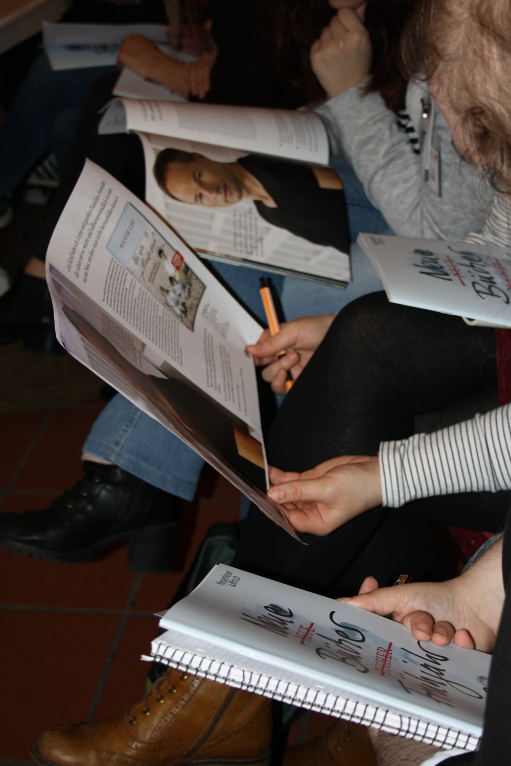 Aus dem aktuellen April-Heft von Melina Kortmann & Lynne Forster (Die Azubis aus der Meerfeldstraße): „Mit den Azubis aus ganz NRW diskutierten Imke Schuster (Vertriebsleiterin) und Benedikt Geulen (Vertreter) vom Dumont Buchverlag, sowie Sabine Glitza (Vertriebsleiterin) und Dorothee Winkler (Vertreterin) vom Verlag Kiepenheuer und Witsch beim diesjährigen Azubitag, am 27. Januar.