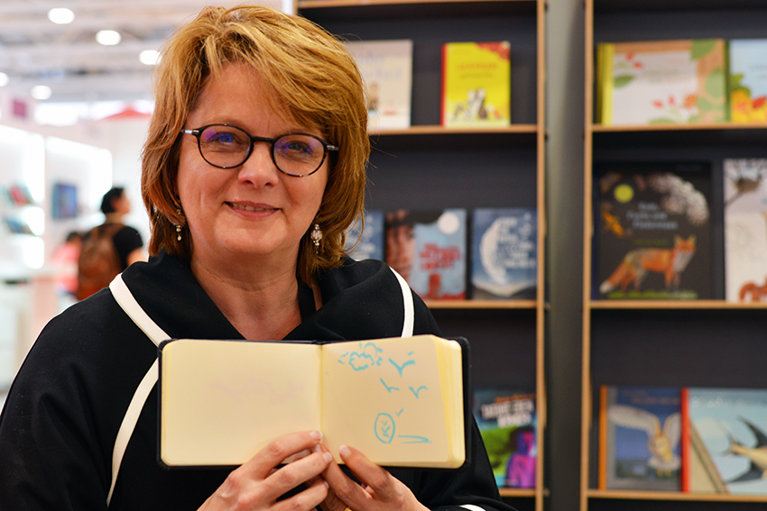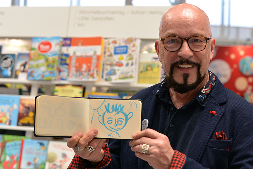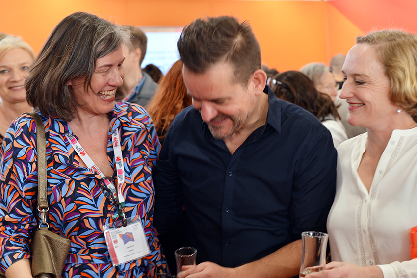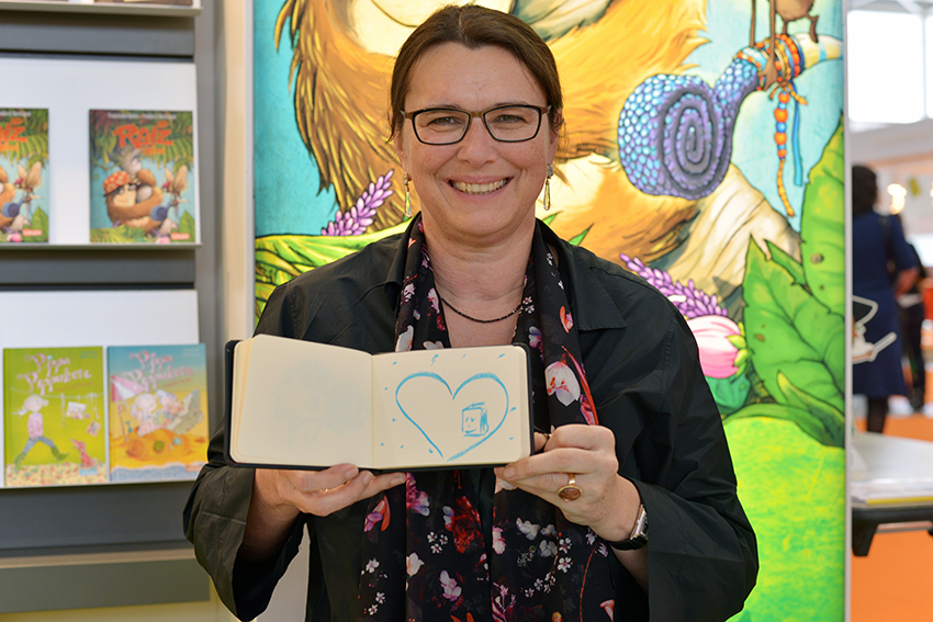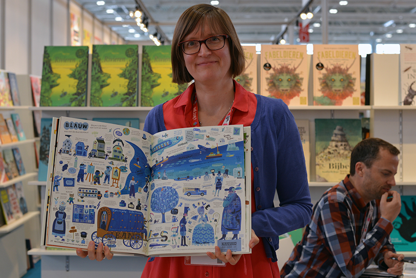 Aber genug gejammert. Der deutsche Gemeinschaftsstand hatte eine schöne Lage am Hallenanfang, Bärbel Becker und Imke Buhre von der Frankfurter Buchmesse sowie avj-Geschäftsführerin Margit Müller freuten sich mit ihren Kolleginnen über die gute Besucher-Frequenz. Von Herzen jubeln konnten die Kollegen vom nicht weit entfernten Stand des niederländischen Querido Verlags, der die Bücher des diesjährigen Astrid Lindgren Memorial Award-Preisträgers Bart Moeyaert im Programm hat. Verlegerin Wendy Wilbers und Lektor Dik Zweekhorst eilten ins Illustratorencafé, wo Zuschauer die Bekanntgabe in Schweden live verfolgen konnten. Das Schönste: Der belgische Autor war anwesend, kam auf die Bühne und konnte sich über große Empathie aus dem Publikum freuen (hier kann man sich das anschauen). Bart Moeyaert war in diesem Jahr ganz sicher der meist umarmte Mann der Messe.