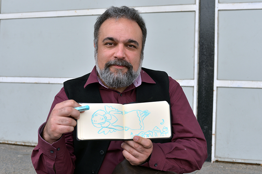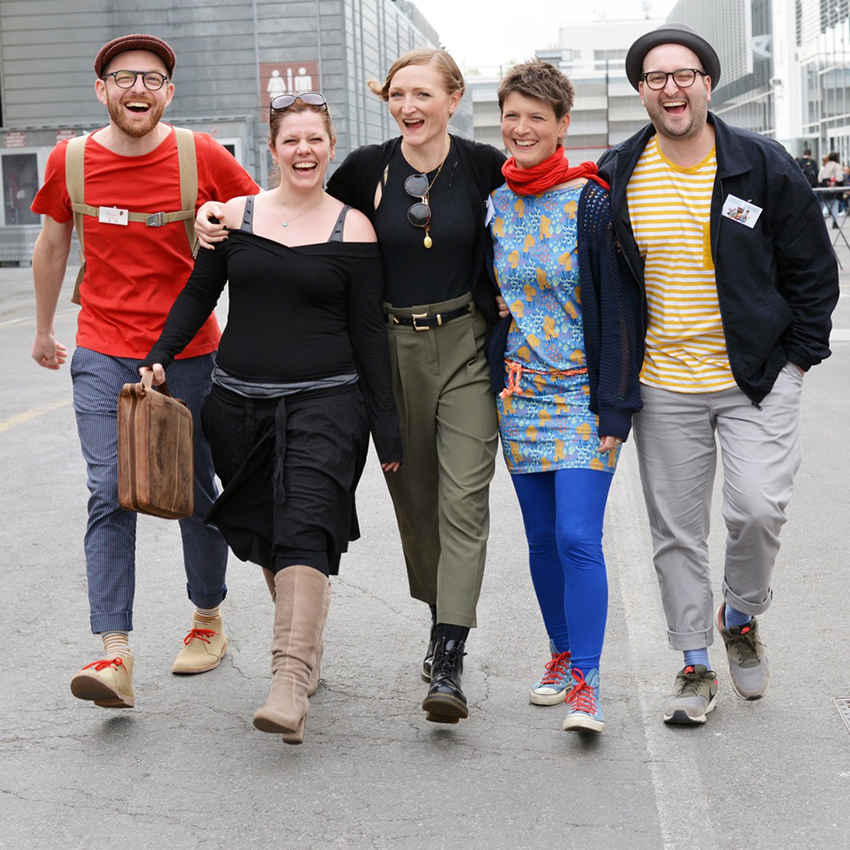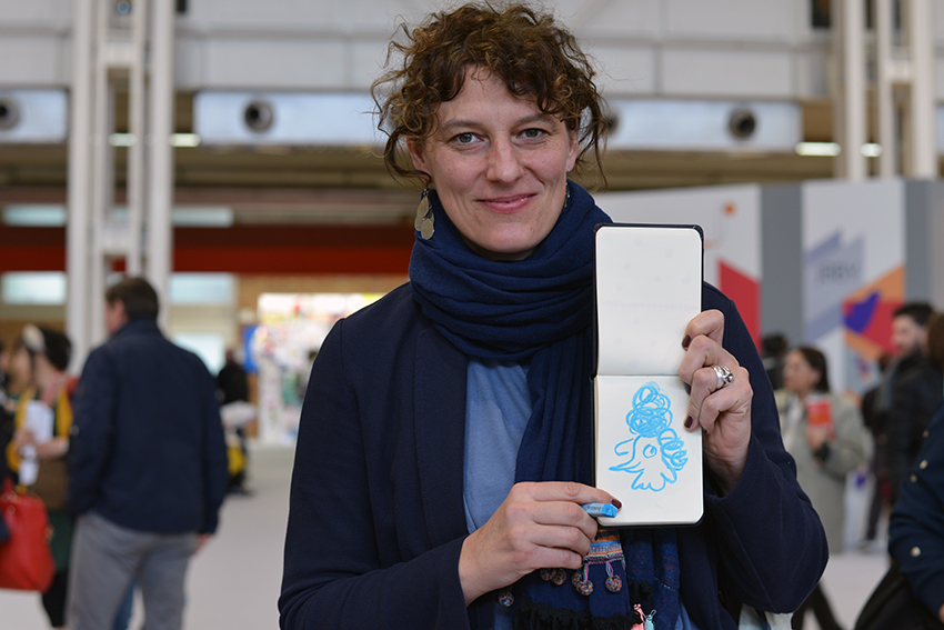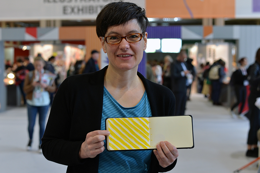 Joëlle Tourlonias teilt sich in Bologna erneut die Unterkunft – das „Familienzimmer“ – mit Alexandra Helm, Judith Allert, Markus Lefrançois und Robert Scheffner. Wie immer feiern sie Bologna, verbreiten gute Laune und haben tolle Projekte in ihren Taschen. In einem davon kann man sogar das Familienzimmer wiederentdeckten – als Erinnerungsbild, das im Hintergrund hängt: Mit Ben liebt Bär und Bär liebt Ben (arsEdition) hat Joëlle Tourlonias nach dem Text von Michael Engler eine sehr persönliche Pappe geschaffen, in der einige weitere Details aus ihrem Leben versteckt sind. Einen zweiten Band mit denselben Charakteren wird es im Herbst zeitgleich geben: Ohne Bär schläft Ben nicht ein. Vom selben Duo kommt bei Baumhaus das Bilderbuch Wir zwei im Winter, und beim 360 Grad Verlag wird es ein Wendebuch geben, bei dem zusätzlich der Illustrator Jan Birck ins Spiel kommt: das 48 Seiten starke Regenland Trockenland.