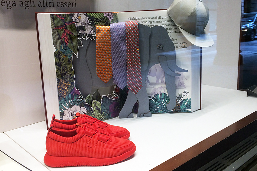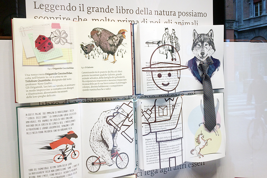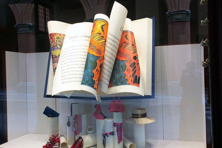Aber spätestens ein kurzer Spaziergang durch die Einkaufsstraßen von Bologna zeigte, wie angesagt (Kinder)Bücher sind. Hermès hatte sein ganzes Schaufenster der Bologna Children’s Bookfair gewidmet. Ein opulentes Buch als Blickfang, und kleinere, die Krawatten und Seidentücher inszenierten. Alles nur Kulisse? Betrachten wir das Ganze doch optimistischer.