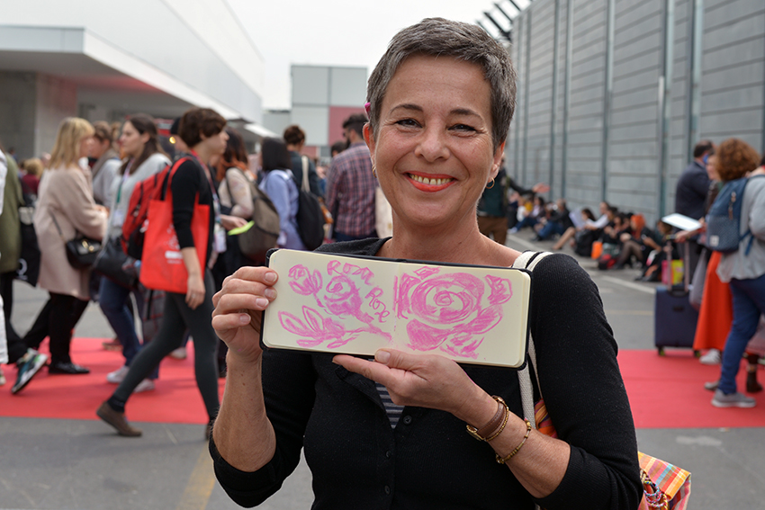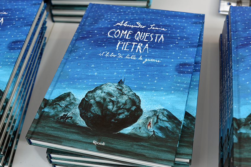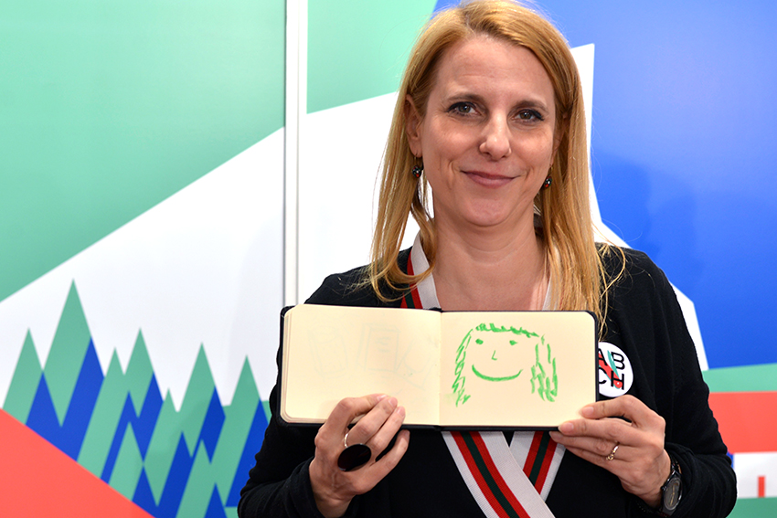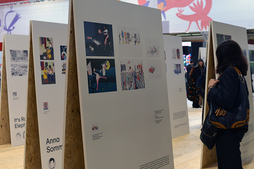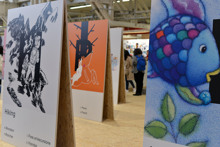 Gastland war diesmal die Schweiz, und die Kollegen (stellvertretend seien Myriam Lang und Dani Landolf vom SBVV sowie Lektor und Kritiker Hans ten Doornkaat erwähnt) haben einen schönen Messeauftritt hingelegt. In der Illustratoren-Ausstellung mochte zwar manch Betrachter Originale vermissen – die Bilder der 26 ausgewählten Künstler waren als Reproduktionen auf Stellwände aufgezogen, die jeweils einem Buchstaben des Alphabets zugeordnet wurden. Dafür fand viel in der Stadt statt, und vor allem für den Illustratoren-Nachwuchs hatte man sich einiges einfallen lassen. In der Scuderia an der Piazza Giuseppe Verdi konnten junge Illustratoren arbeiten und sich austauschen, wenn sie nicht gerade die Messe erkundeten. In der Scuderia fand am Dienstag Abend auch die Pop-up-Party der Schweizer statt, bei der viele Gäste die laue Frühlingsnacht genossen und sich auf der Piazza unterhielten. Spät am Abend wurde dort auch noch Bart Moeyaert gesichtet.