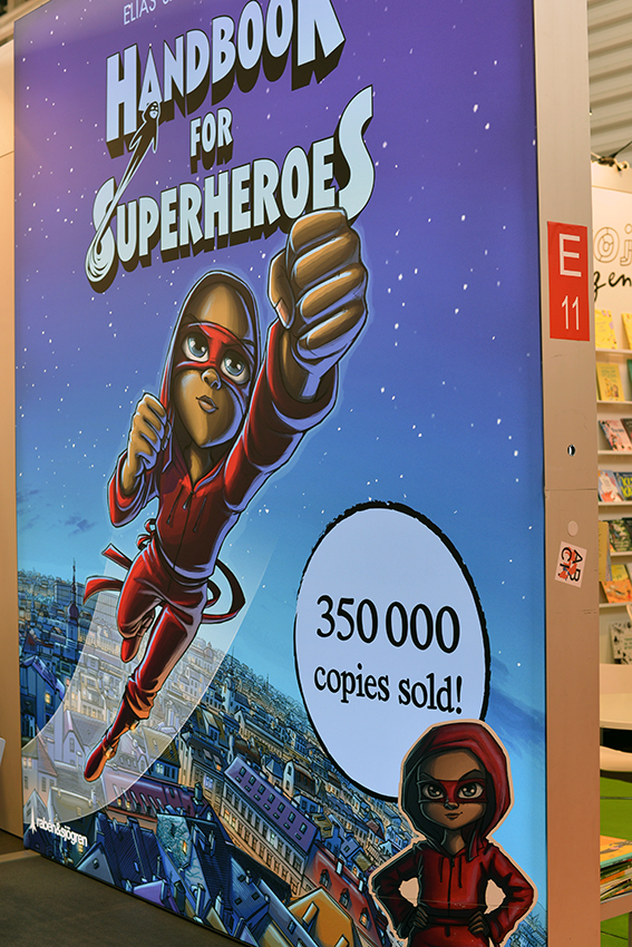 Orell Füssli bringt ein von Ingo Herzke übersetztes Kinderbuch von Eoin Colfer: Der Hund, der sein Bellen verlor. Kosmos setzt auf Kepler 62, eine Sci-Fi-Reihe für Leser ab zehn Jahren, in der Timo Parvela und Bjorn Sørtland sich als Autoren abwechseln. Das Buch wurde bereits in 14 Länder verkauft. Jacob & Stuart-Verleger Edmund Jacoby macht uns auf den Stand des schwedischen Verlags Rabén & Sjögren aufmerksam. Ganz groß inszeniert ist dort die Serie Handbuch für Superhelden von Elias und Agnes Vahlund. 350.000 verkaufte Exemplare im kleinen Schweden und das hochaktuelle Thema Mobbing – wir sind gespannt auf die deutsche Ausgabe und die Resonanz.