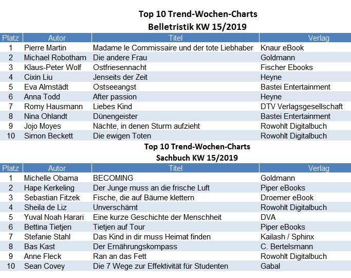 Die Top 10 ebook Trend Charts in Belletristik und Sachbuch werden wöchentlich durch media control GmbH ermittelt und in den eBook-Shops zur Verfügung gestellt: