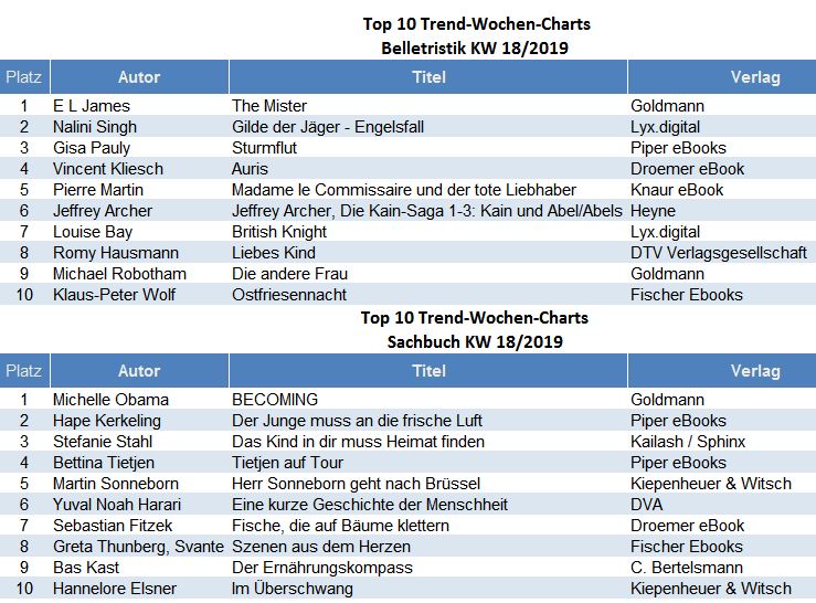 Die Top 10 ebook Trend Charts in Belletristik und Sachbuch werden wöchentlich durch media control GmbH ermittelt und in den eBook-Shops zur Verfügung gestellt: