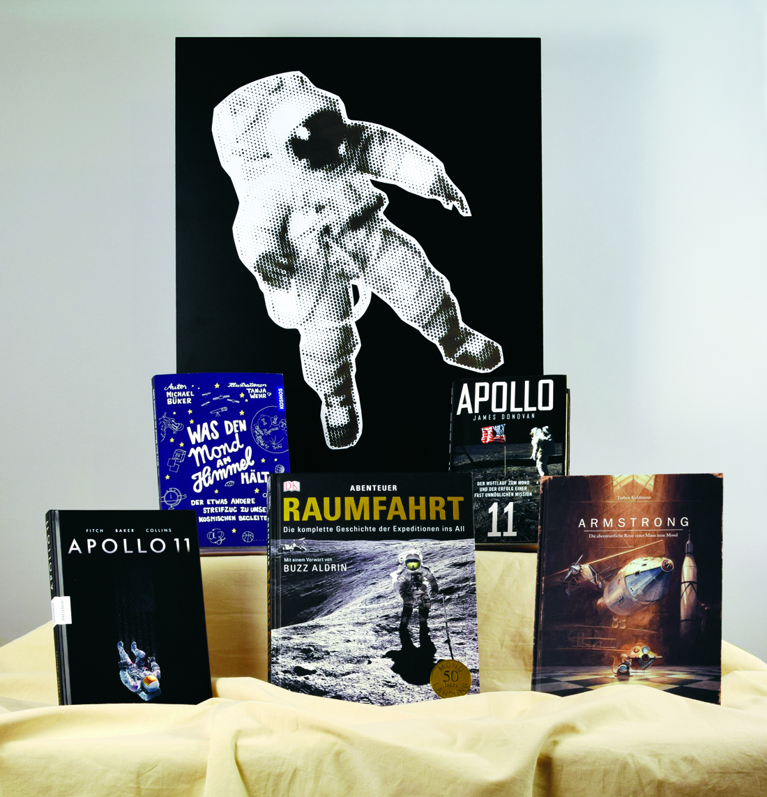 Für unsere Deko zum 50. Jubiläum der Mondlandung brauchen Sie schwarze Präsentationspappe im Format 70 x 50 cm oder größer (Schreibwaren-Geschäft/Künstlerbedarf). Und hier gibt es den Astronauten zum Ausdrucken in vier Teilen: deko Raumfahrt . Sollten Sie mehr Platz haben, machen sich auch mehrere Pappen mit mehreren schwebenden Astronauten gut.