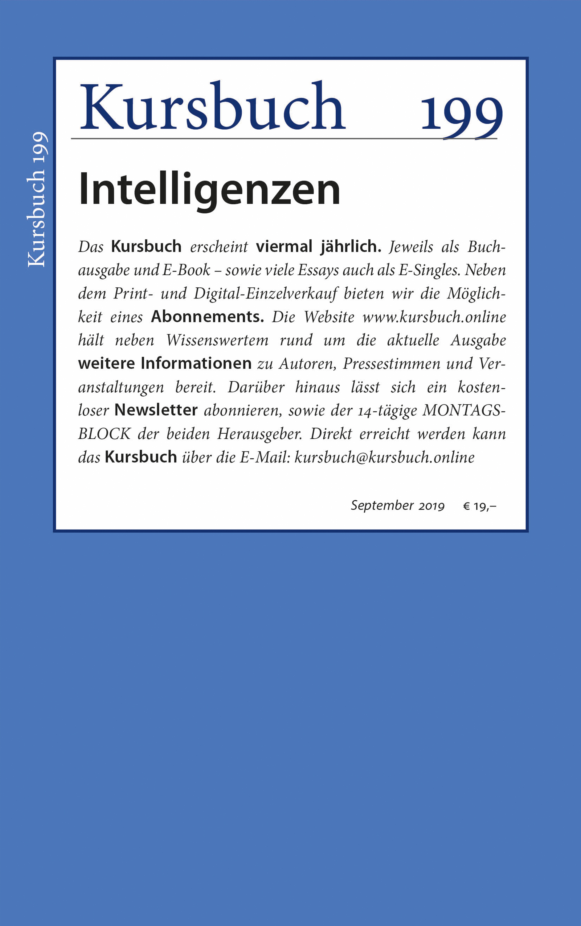 Die Kursbuch-Herausgeber Armin Nassehi und Peter Felixberger räumen ihnen in einer eigenen Rubrik einen Platz ein, um eigene Zugänge und Reflektionen zum Thema „Intelligenzen“ im entsprechenden Kursbuch zu veröffentlichen. Ziel des Kursbuchs 199 „Intelligenzen“ ist es – gerade vor den möglichen Horizonten, die die Entwicklung Künstlicher Intelligenzen aufspannt – unsere Konzepte von Wissen und Intelligenz auf den Prüfstand zu stellen und abzuklopfen, in welchem Verhältnis Wissen, Bildung, Erfahrung, Erleben, Vernunft und Ratio mit dem stehen, was wir heute Intelligenz nennen.