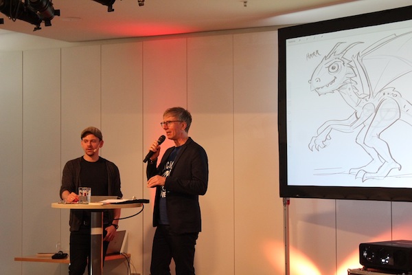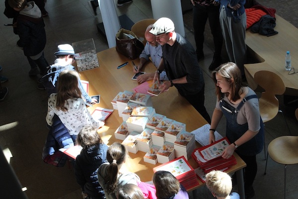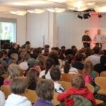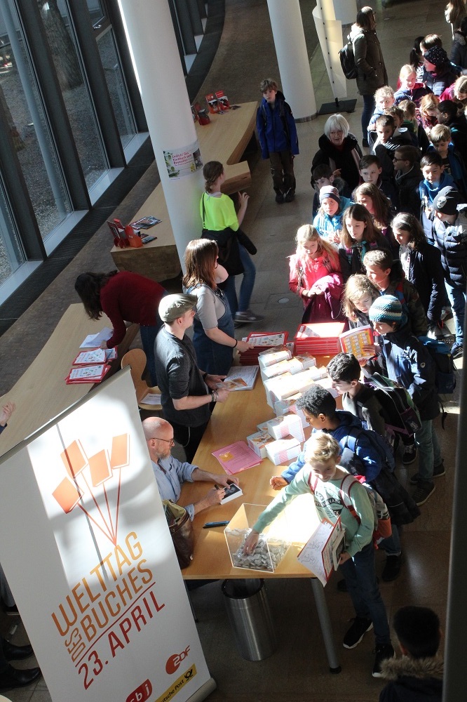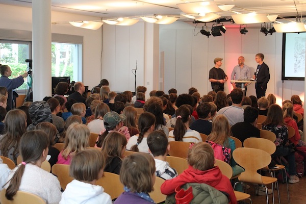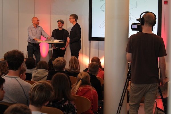 Auch dieses Jahr besuchten zum Weltttag des Buches wieder Schulklassen die Verlagsgruppe Random House: Sie hörten dem cbj Autor THiLO beim Lesen aus dem Welttagsbuch und sahen dem Illustrator Timo Grubing beim Zeichnen des Welttagscomics zu. Und sie löcherten die beiden am Ende der Veranstaltung mit zahlreichen Fragen. Durch die Lesung, das Live-Zeichnen am Tablet sowie das anschließende Gespräch führte Moderator Günter Keil.