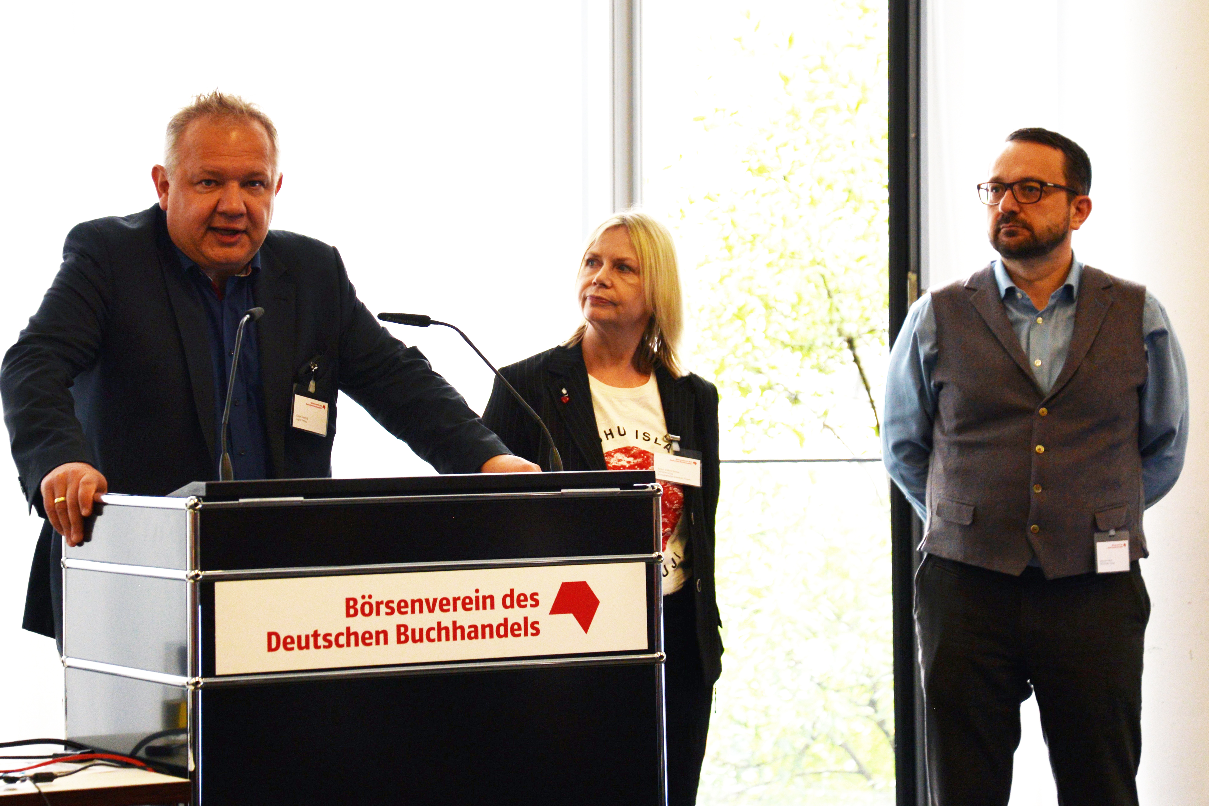 Kilian Kissling, Heike Völker-Sieber (der hörverlag/Random House Audio) und Johannes Ackner (Buchfunk) vom Sprecherkreis der IG-Hörbuch begrüßen die Teilnehmer