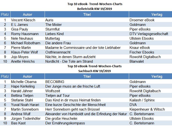 Die Top 10 ebook Trend Charts in Belletristik und Sachbuch werden wöchentlich durch media control GmbH ermittelt und in den eBook-Shops zur Verfügung gestellt:
