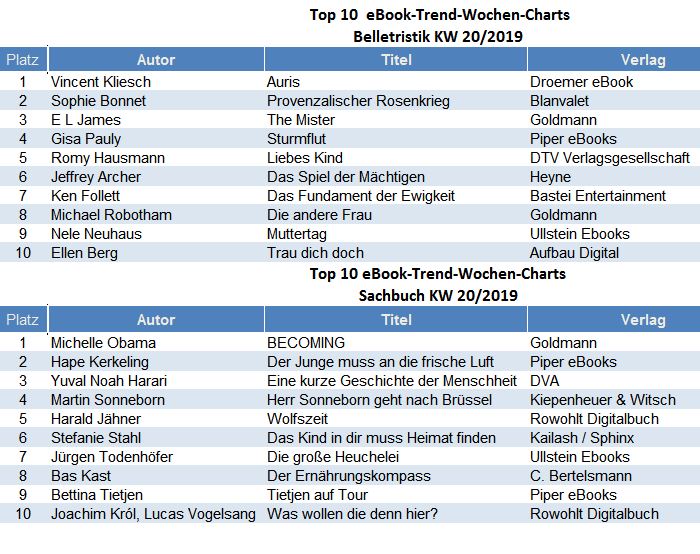 Die Top 10 ebook Trend Charts in Belletristik und Sachbuch werden wöchentlich durch media control GmbH ermittelt und in den eBook-Shops zur Verfügung gestellt: