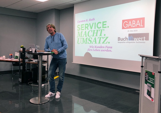 Nach diesem praxisnahen Input und einem Ausblick auf die Buchwert-Agenda der kommenden Monate durch Michael Rosch, unterhielt Carsten K. Rath mit einer lebendigen Vorstellung zum Thema „Service. Macht. Umsatz“. Der Hotelier, Unternehmer und bekannte Keynote Speaker zeigte anschaulich, wie guter Service funktioniert und in einem Unternehmen den Umsatz steigert – wenn man es schafft, die Kunden persönlich abzuholen. Denn, wie er in einer seiner Publikationen ausführt: „Für Herzlichkeit gibt es keine App“.