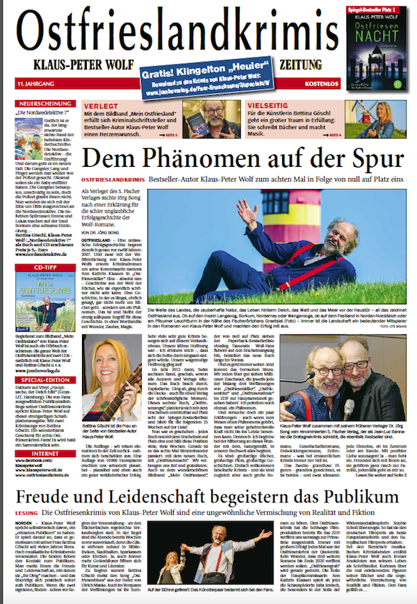 Wenn am 26. Juni mit Todesspiel im Hafen der dritte Band (und Abschluss) von Klaus-Peter Wolfs Sommerfeldt Trilogie erscheint, wird auch die neue Ausgabe der von ihm vor elf Jahren erfundenen Ostfrieslandkrimizeitung fertig sein. Diese jetzt schon elfte Ausgabe erscheint in erneut erhöhter Auflage von diesmal 1,65 Millionen Exemplaren, die bundesweit als Zeitungsbeilage gestreut werden. 65.000 werden davon kostenlos an den Buchhandel ausgeliefert.