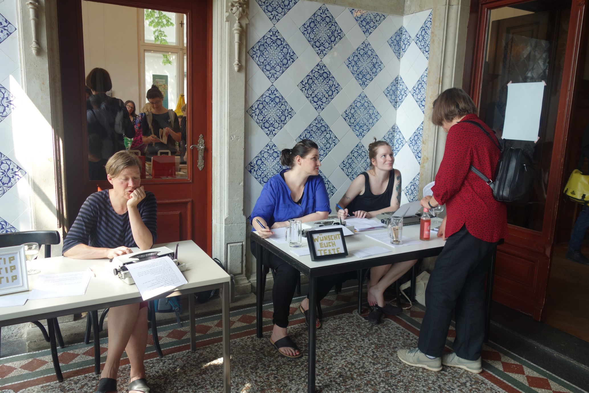Gut angenommen wurden auch die Autorenlesungen, die im 15-Minuten-Takt im Großen Saal des LCB über die Bühne gingen. Zu Gast waren unter anderem Lola Randl, Dilek Güngör, Bastian Kresser, Marion Schmidt, Kali Drische, Tobias Schwartz und Sandra Gugic. Mit dabei war außerdem wieder „Literatur für das, was passiert ist“, eine Gruppe von Schriftstellerinnen und Schriftstellern, die sich zusammengetan haben, um mit ihrem Schreiben Menschen auf der Flucht zu helfen. Auf Wunsch verfassten sie an ihren Schreibmaschinen Texte. Die dafür entgegengenommenen Spenden gehen an Pro Asyl. Am Abend ist im Garten des LCB Musik angesagt: Dann tritt der Klarinettist Malte Schiller mit der Combo „Clarinets of Glory“ auf.