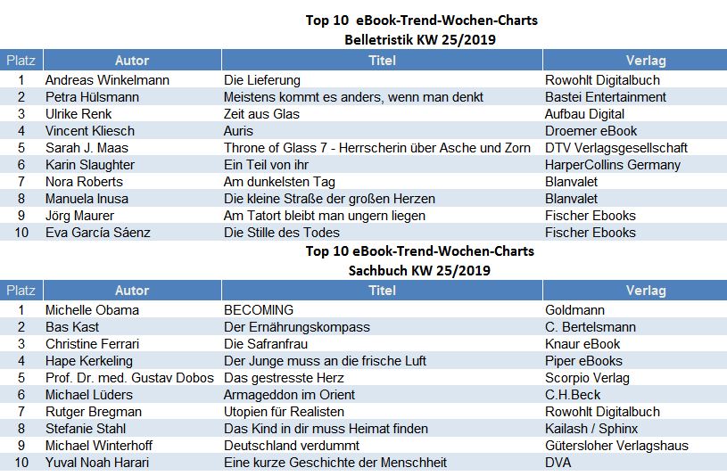 Die Top 10 ebook Trend Charts in Belletristik und Sachbuch werden wöchentlich durch media control GmbH ermittelt und in den eBook-Shops zur Verfügung gestellt: