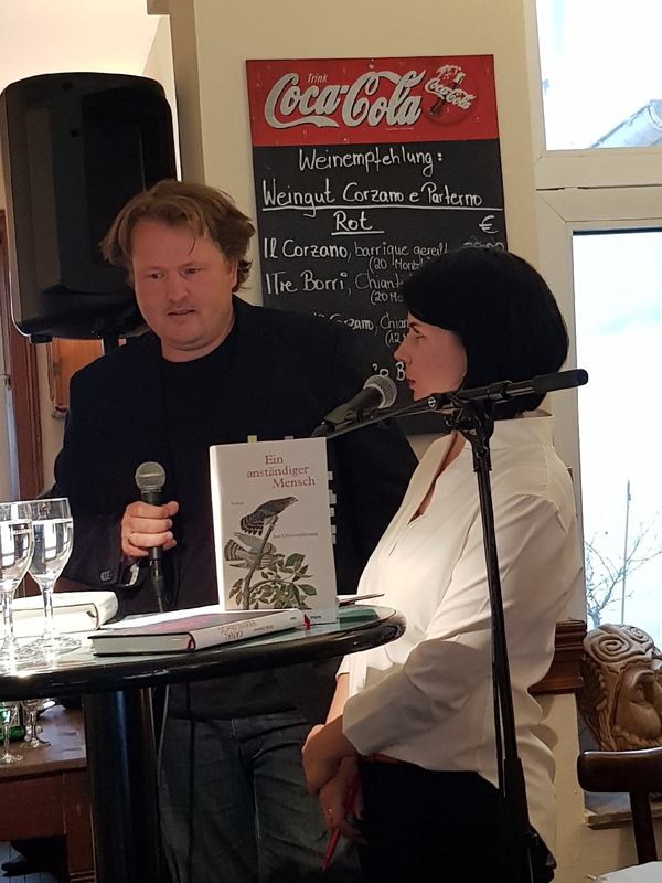 Im Anschluss übernahm diesmal Literaturexpertin Karla Paul die weitere Moderation des Abends. Mit Jan Christophersen sprach sie über dessen neues Buch Ein anständiger Mensch, das von zwei Paaren erzählt und einem Wochenende, das die Grenzen von Anstand und Schuld ins Wanken bringt.
