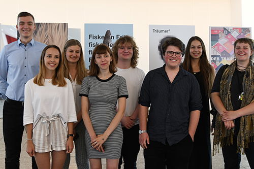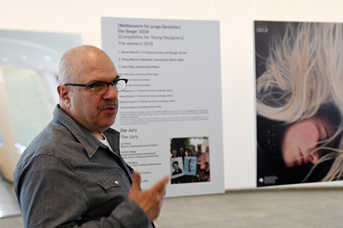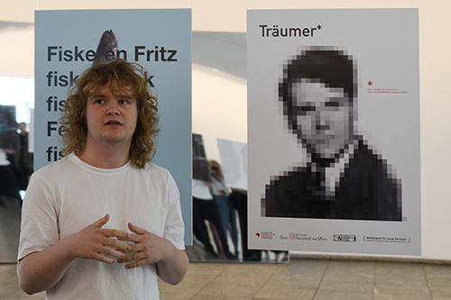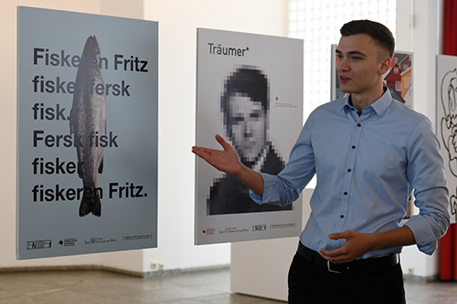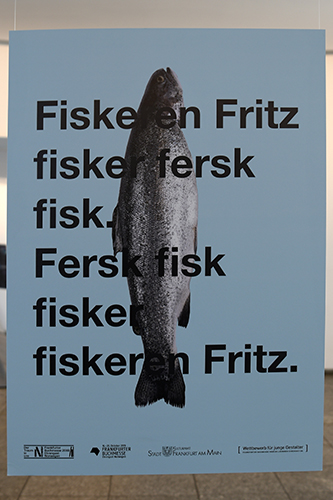 Der zweiplatzierte Philip Martin Pothfelder, Hochschule Rhein-Waal Kleve, war anwesend. Er interpretierte den allgemein bekannten Spruch Fischers Fritze auf ganz eigene Weise: mit Schrift auf einem Fisch. „Die dadaistisch anmutende Übertragung eines deutschen Zungenbrechers ins Norwegische und die konsequente Gestaltung überzeugen“, stellte die Jury fest. „Darüber hinaus handelt es sich um schöne, ausgewogene Typografie“, bemerkte Eibes. „Jeder kennt den Spruch, ich wollte mit ihm eine Verbindung zum Ehrengast schaffen“, ergänzte Pothfelder, der eine Prämie von 1000 Euro erhält.