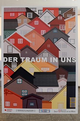 Olesja Arndt schuf ein folkloristisch anmutendes Plakat mit dicht aneinandergereihten bunten Häusern, die einander ähneln, aber nicht gleichen. Ist es der Traum vom eigenen Heim? Oder ist es der Traum, aus der Enge herauszukommen? Es liegt im Auge des Betrachters und regt sicherlich Diskussionen an.