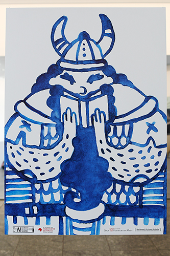 Sofort erkennen lässt sich der lesende Wikinger in Blau, erinnert aber in Frankfurt außerdem an den Bembel, den Apfelweinkrug. Eine klare wie auch mehrdeutige Arbeit von Julia Baumgarten.