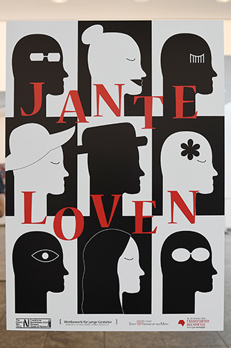 Ein gegenwärtig in Norwegen heiß diskutiertes Thema hat Chiara Birke mit ihren verschiedenen Köpfen in Schwarz-Weiß und dem rot geschriebenen Wort „Janteloven“ aufgegriffen, wie Simone Bühler bemerkte. Es geht um einen Verhaltenskodex sozialer Spielregeln, um Bescheidenheit und das Vermeiden von Neid.