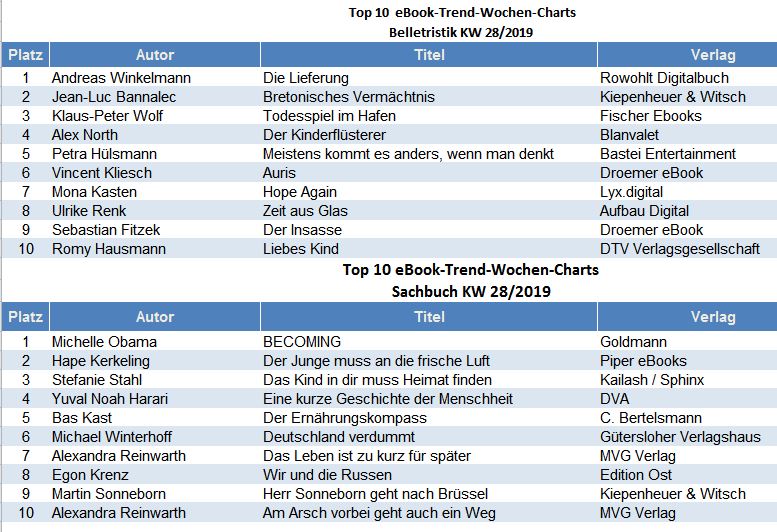 Die Top 10 ebook Trend Charts in Belletristik und Sachbuch werden wöchentlich durch media control GmbH ermittelt und in den eBook-Shops zur Verfügung gestellt: