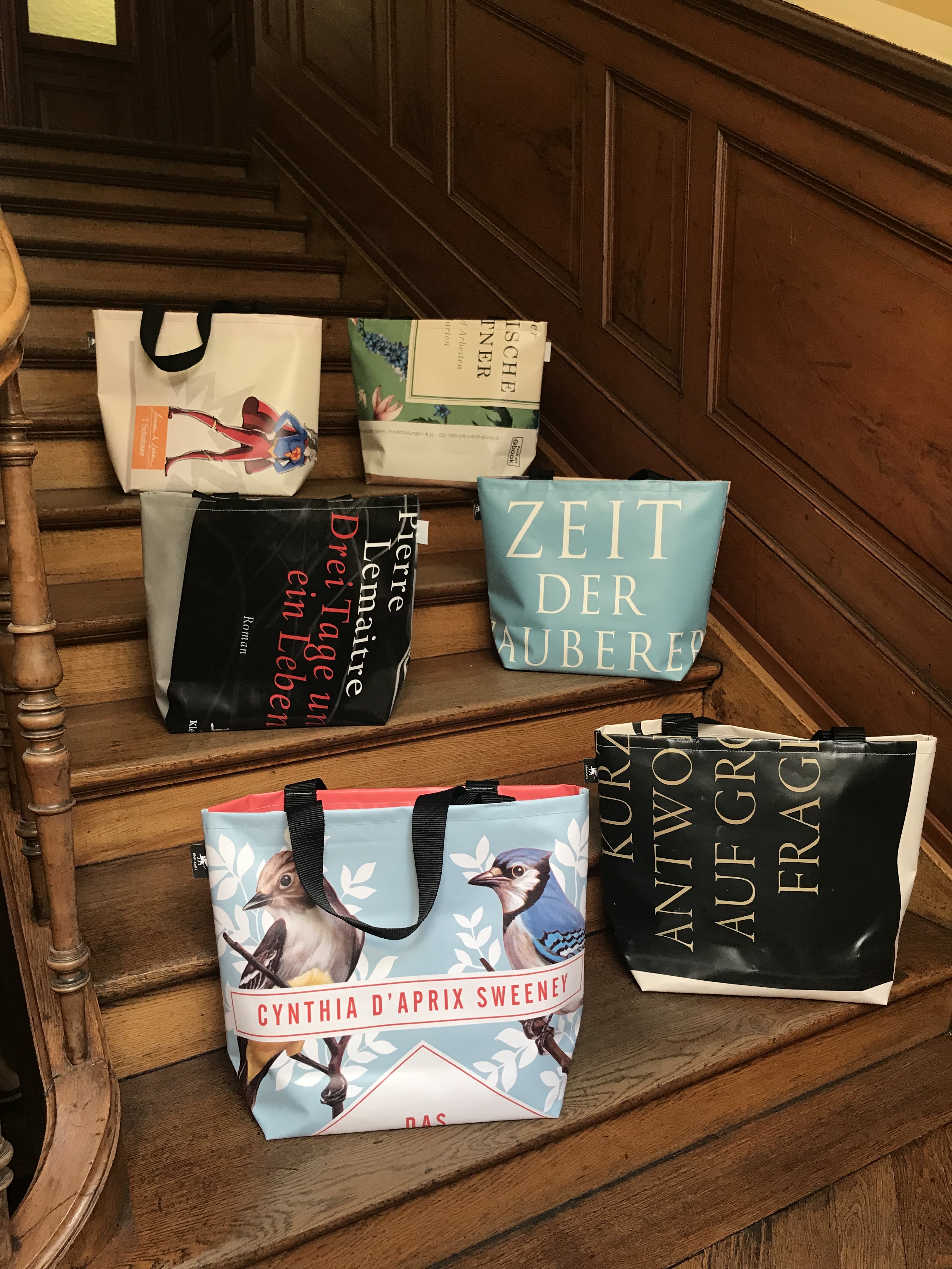 Schöne Aktion von Klett-Cotta: Wenn man das Areal der Klett Gruppe in Stuttgart betritt, trifft der Blick unweigerlich auf ein unübersehbares Schaufenster, das abwechselnd Autoreninnen und Autoren des Klett-Cotta Verlags mitsamt deren aktuellen Büchern abbildet. Durch den steten Wechsel sammeln sich diese Werbebanner mit der Zeit an. Erneut kooperiert der Verlag mit der Lederschmiede der Caritas Stuttgart, die ehemaligen Drogenabhängigen projektbezogen hilft, ihren Weg zurück ins Berufsleben zu finden. Sie kreieren aus diesen „Abfällen“ Unikate, Taschen mit überraschenden Designs, und immer mit dabei Buchcover – u. a.: Cynthia D’Aprix Sweeney – Das Nest, Stephen Hawking – Kurze Antworten auf große Fragen und Wolfram Eilenberger – Zeit der Zauberer.