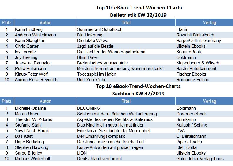 Die Top 10 ebook Trend Charts in Belletristik und Sachbuch werden wöchentlich durch media control GmbH ermittelt und in den eBook-Shops zur Verfügung gestellt: