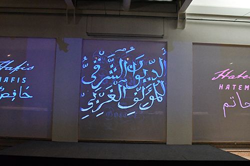 Stefan Matlik verwendete die Schriftzeichen für seine Projektionen, die auf fünf Leinwänden und dreifach in der Exposition zu sehen sind. Auch sie verdeutlichen Goethes Faszination für die arabische Schrift, in der er sich selbst übte.