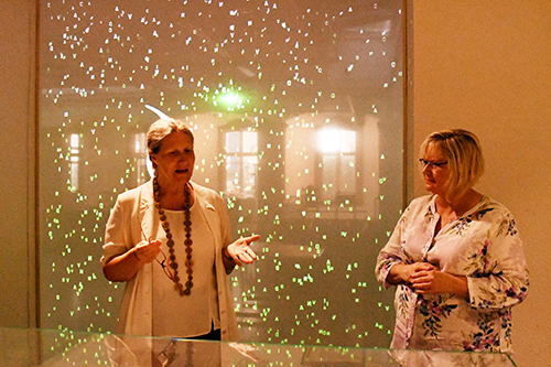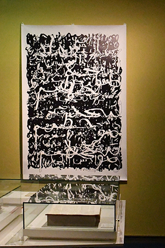 Kuratorin Anke Bosse verwies auf drei Palimpseste von Axel Malik, die in der Ausstellung zu sehen sind. Auf ihnen überlagern sich (arabische) Schriftzeichen und werden so zu neuen Werken der Gegenwartskunst.