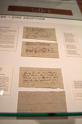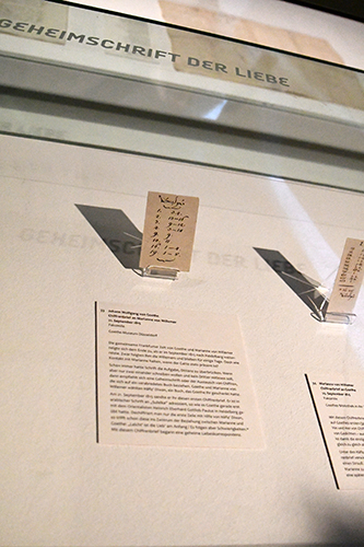 „Die Ausstellung im Goethe-Haus beschäftigt sich mit der Verwandlung orientalischer Quellen durch Goethe in Poesie“, erklärte Direktorin Anne Bohnenkamp-Renken. Sie verwies auf die Exposition Marianne von Willemer und Goethe im Spiegel des West-östlichen Divans 2014 anlässlich des 200. Jahrestages der Begegnung des Dichters mit Marianne Jung, die noch 1814 den Frankfurter Bankier Johann Jakob Willemer heiratete. Dennoch entspannte sich zwischen Goethe und Marianne von Willemer ein ungewöhnliches Verhältnis; er liebte als Hatem die schöne Suleika alias Marianne. Ein Dialog zwischen beiden in Versform ist im Buch Suleika im West-östlichen Divan erhalten, wenigstens drei Gedichte stammen nachweislich von Marianne. Außerdem schenkte Goethe ihr eine Ausgabe des Diwan von Hafis; auf kleinen Zetteln – sie sind in der Ausstellung zu sehen – notierten Goethe und Marianne die Nummern von Versen und unterhielten sich so ohne Worte in Chiffren miteinander. „Ganz besonders interessant sind Zettel aus Goethes Papierkorb, die wir dem Architekten Sulpiz Boisserée, Goethes Reisebegleiter, verdanken“, bemerkte Bohnenkamp-Renken.