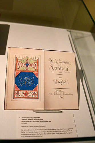 Seit der Entdeckung des Diwan von Hafis beschäftigte sich Goethe mit dem „ungeheuren Stoff“ des Orients und las über 100 Bücher. „Wir betrachten exemplarisch 16 Gedichte in der Ausstellung intensiver“, sagte Bosse, „und laden den Besucher so in die poetische Werkstatt Goethes ein.“ Goethe sah Hafis nicht nur als Zwillingsbruder, sondern auch als Konkurrent in einem Wettstreit. „Die Poesie aus dem 14. Jahrhundert wird in Goethe ebenso gegenwärtig wie die eigene Jugend“, sagte die Kuratorin. Seine Divan-Gedichte schrieb Goethe in lateinischen Schriftzeichen, ein Hinweis, dass er Weltliteratur im Sinne von Dichtung begriff, die in allen Sprachen und Kulturen anzutreffen ist.