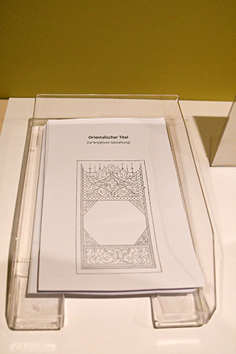 Die Exposition, die bis zum 23. Oktober zu sehen ist, hat auch drei Stationen, an denen der Besucher selbst aktiv werden kann. Das Buchorakel (Fal) ist ein alte Methode, um sich aus Büchern wie der Bibel, dem Koran oder auch dem Diwan selbst Anregungen für das eigene Leben zu holen. Ein „orientalischer“ Titel kann gestaltet, arabische Schriftzüge können geübt werden.