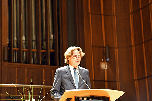 Michael Reckhard, Mitglied der Geschäftsleitung der WI Bank, erinnerte an den Namensgeber des Preises: „Robert Gernhardt hatte die Gabe, genau die richtigen Worte zur richtigen Zeit zu finden.“ Das sei etwas Besonderes – viele vergebliche Versuche könne man täglich auf Twitter nachlesen. Die Versuchung sei groß, alles Mögliche mit der Welt zu teilen. Dabei sei allerdings auch eine Verrohung der Sprache, die in Gesellschaft und Politik hineinreiche, feststellbar.
