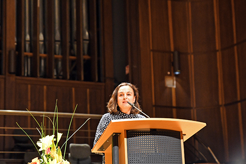 „Wir suchen immer neue, spannende Orte, wo sich Theater, Musik und Literatur verbinden – in diesem Jahr ist es die HfMDK“, sagte Ayse Asar, Staatssekretärin im hessischen Kultusministerium. Der seit 2009 vergebene Robert Gernhardt Preis habe einen hohen Anspruch: Literatur müsse schon nach sechs Seiten spürbar werden. Für die elfte Preisverleihung las die Jury – Eva Demski, Christoph Schröder und Karl Heinz Götze – 79 Bewerbungen. Die Namen der Autoren blieben zunächst geheim. „Waren es in manchen Jahren zwei Bewerbungen, die von der Jury für die Auszeichnung vorgeschlagen wurden, fand für den elften Preis nur Nina Bußmann die Anerkennung der Juroren“, bemerkte Asar.