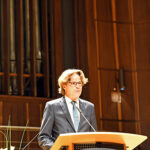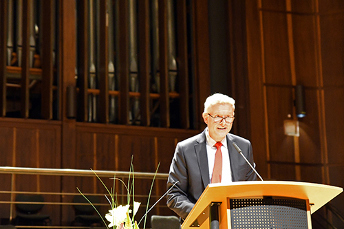 Ernst August Klötzke, Vizepräsident der HfMDK, begrüßte die Gäste: „Es ist eine große Ehre, Gastgeber für die feierliche Verleihung des elften Robert Gernhardt Preises zu sein.“ Allerdings berge so ein Preis für noch Unfertiges auch Risiken, die jedoch mutig von den Preisstiftern, der Wirtschafts- und Infrastrukturbank Hessen (WI Bank) und dem Hessischen Ministerium für Wissenschaft und Kunst, in Kauf genommen würden.