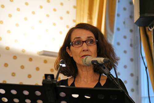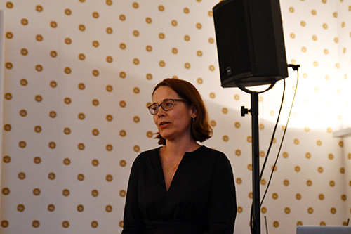 Sonja Vandenrath vom Kulturamt Frankfurt begrüßte die Gäste: „Zum ersten Mal ist die seit 2016 bestehende Reihe Lyrik lesen in Frankfurt zu Gast. Wir wollen damit auch den Rausch des Festivalkongresses Fokus Lyrik, der im März in Frankfurt stattfand, wieder aufnehmen – der Saal ist voll, ein gutes Zeichen.“ Außerdem verwies Vandenrath auf die Bedeutung eines guten Kulturradios: „Der Mitveranstalter von Lyrik lesen und an diesem Abend unser Kooperationspartner – der Radiosender Deutschlandfunk Kultur – ist wichtig. Genauso wichtig ist hr2-kultur in Hessen und muss erhalten bleiben.“ Das Publikum stimmte dieser Forderung mit Beifall zu. Neben Deutschlandfunk Kultur und dem Kulturamt Frankfurt gehörte das Deutsche Literaturarchiv Marbach zum Veranstaltertrio.