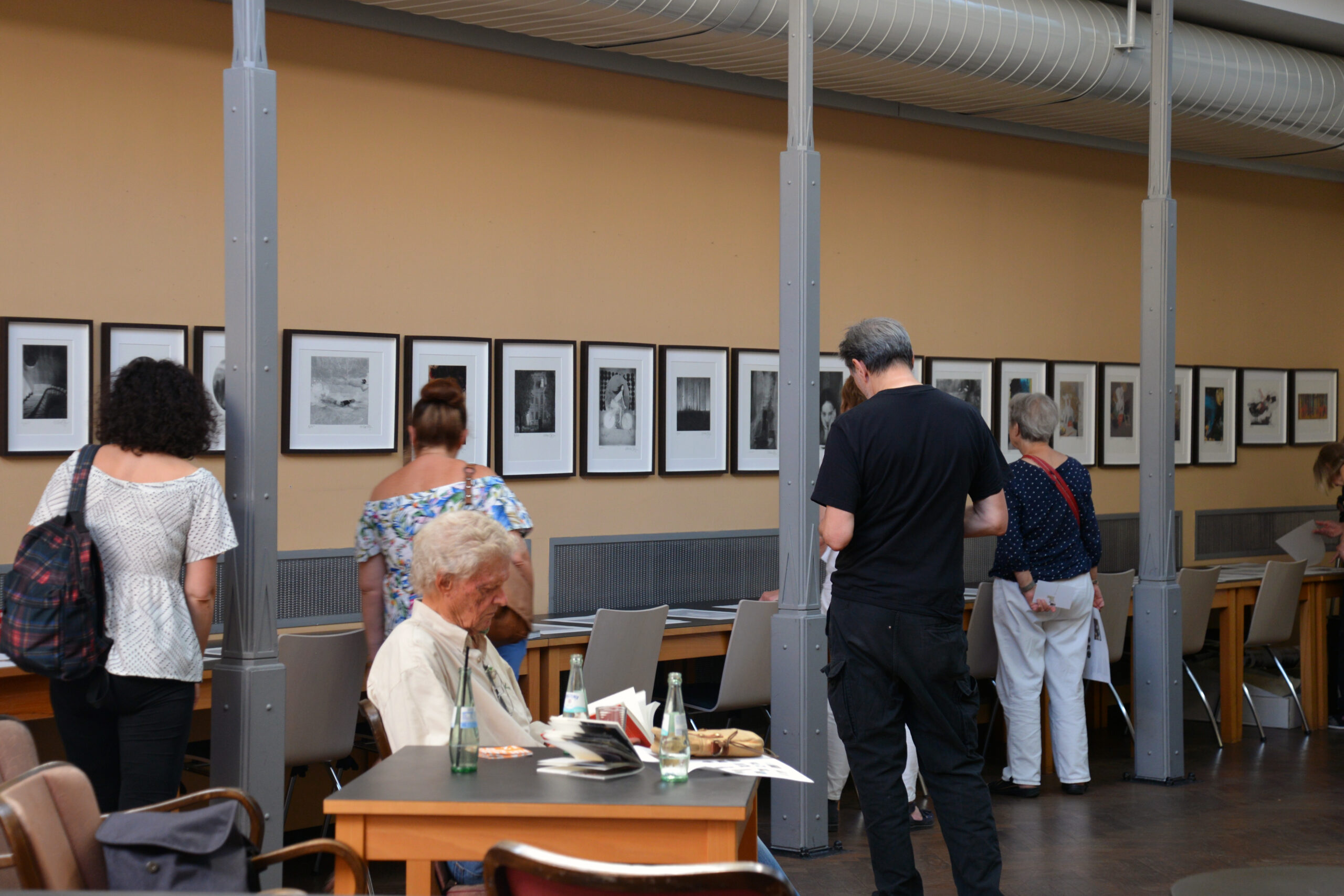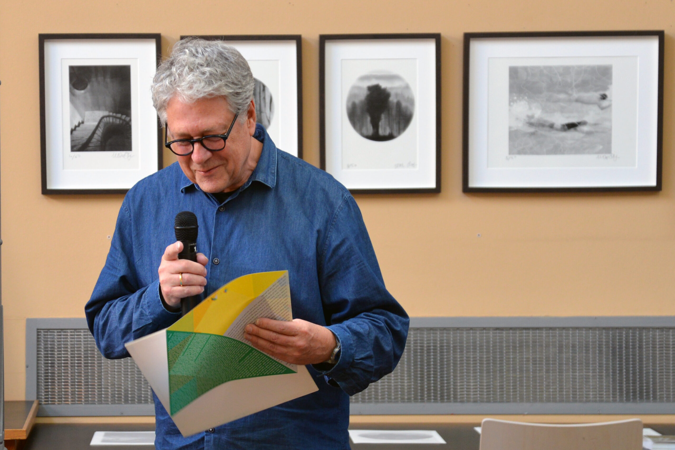 Heute Nachmittag wurde eine kleine, feine Ausstellung mit Bildern der Illustratorin Ulrike Möltgen im Heine Haus in Düsseldorf eröffnet. Rudolf Müller, der mit Selinde Böhm die Müller & Böhm Literaturhandlung im Heine Haus betreibt, erinnerte sich in seiner Ansprache daran, wie Ulrike Möltgen eines Tages – damals noch im Ladenlokal in der Neustraße – vor ihm stand und ihm eine Arbeit zu Gertrude Stein anbot. Das Blatt in einer Hülle sei etwas sperrig gewesen, erzählte der Buchhändler, aber auch interessant. Wenn er 50 Stück abnehme, habe sie eine Wette gewonnen, habe die Studentin von Wolf Erlbruch damals erklärt. Und dann habe er eben 50 Stück genommen.